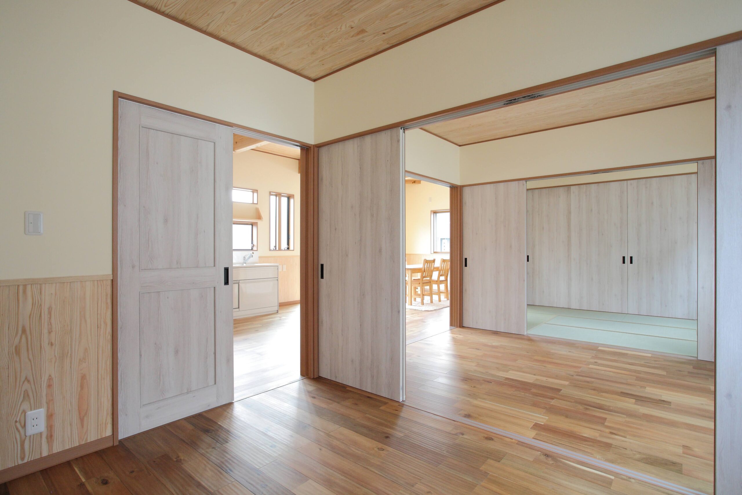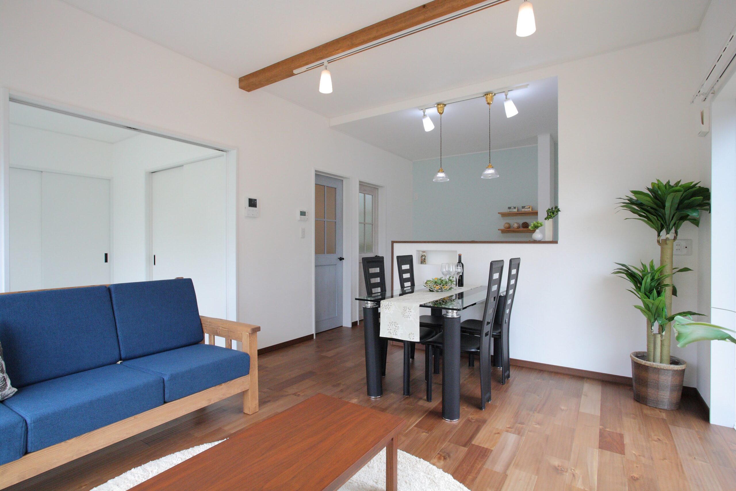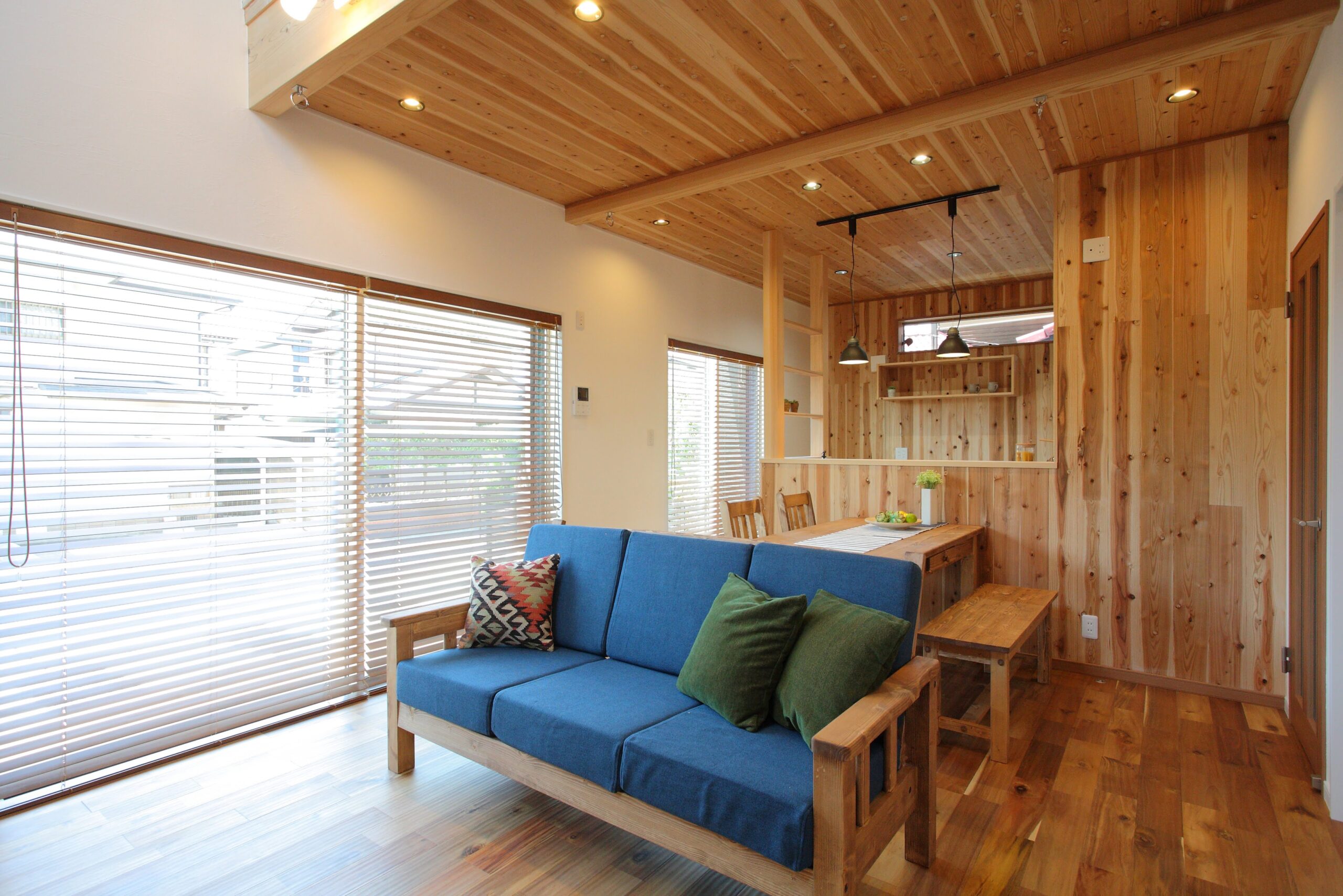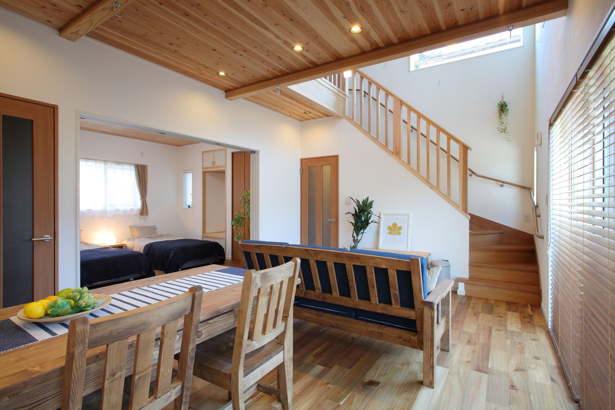 肌触りの良い無垢材の床、珊瑚や和紙から生まれた壁材で塗られた壁面など、健康にも配慮された自然素材を”南欧風”にアレンジしました。家具や小物とのコーディネートで雰囲気をあなた好みに♪